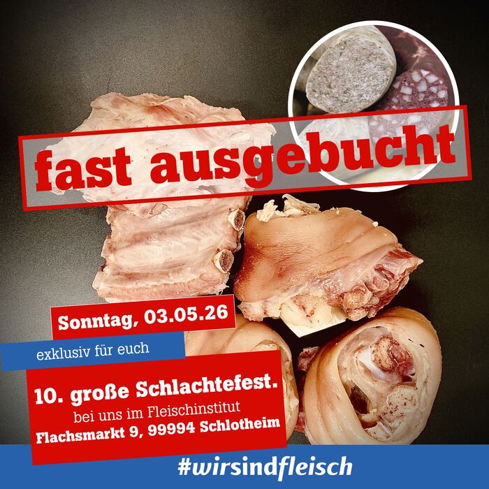 Sofern nicht anders angegeben ist der Veranstaltungsort unser fleischinstitut in Schlotheim, Flachsmarkt 9, 99994 Schlotheim, Thüringen, Deutschland